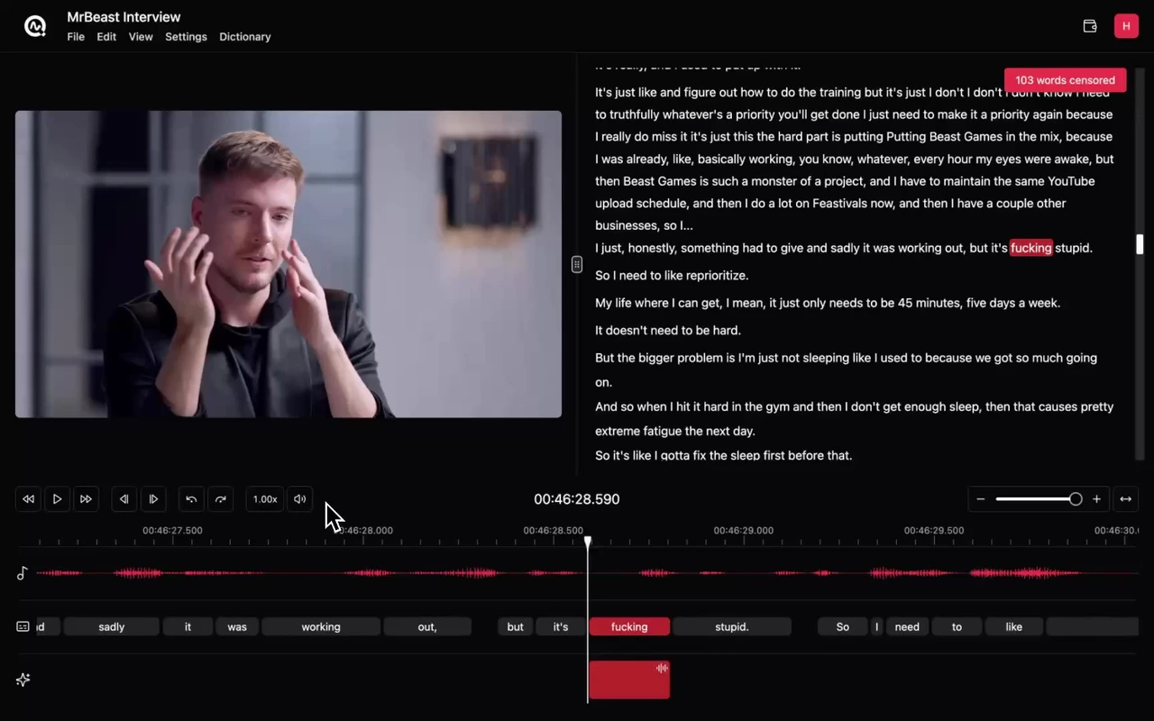 Pick what you want to filter, adjust censor effects, check for transcript errors, and fine-tune the alignment if needed.